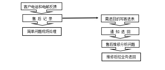 1)当售后接到客户反馈的问题后,判断是否需要返回维修,需要退回的,跟业务交流后,业务部通知客户退回。业务收到客退品后,填写《客退品跟踪单》和返修品交维修部。