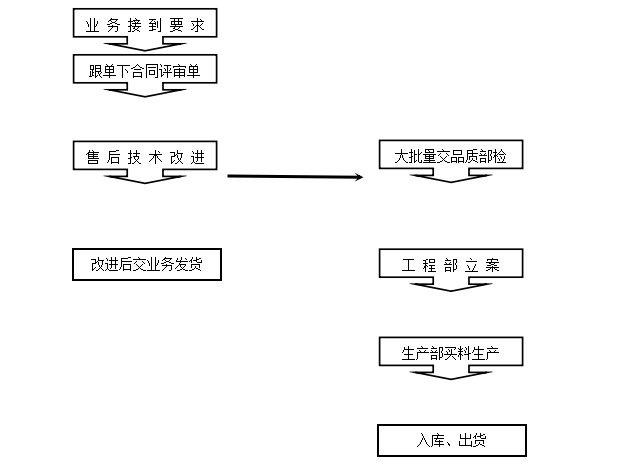 1)当业务部接到特殊订单时,跟单根据业务员提供客户的要求下《合同评审单》。交与售后,售后根据单据要求领料改进。小批量样品改进检测合格后,(10套以下)交业务部发给客户。