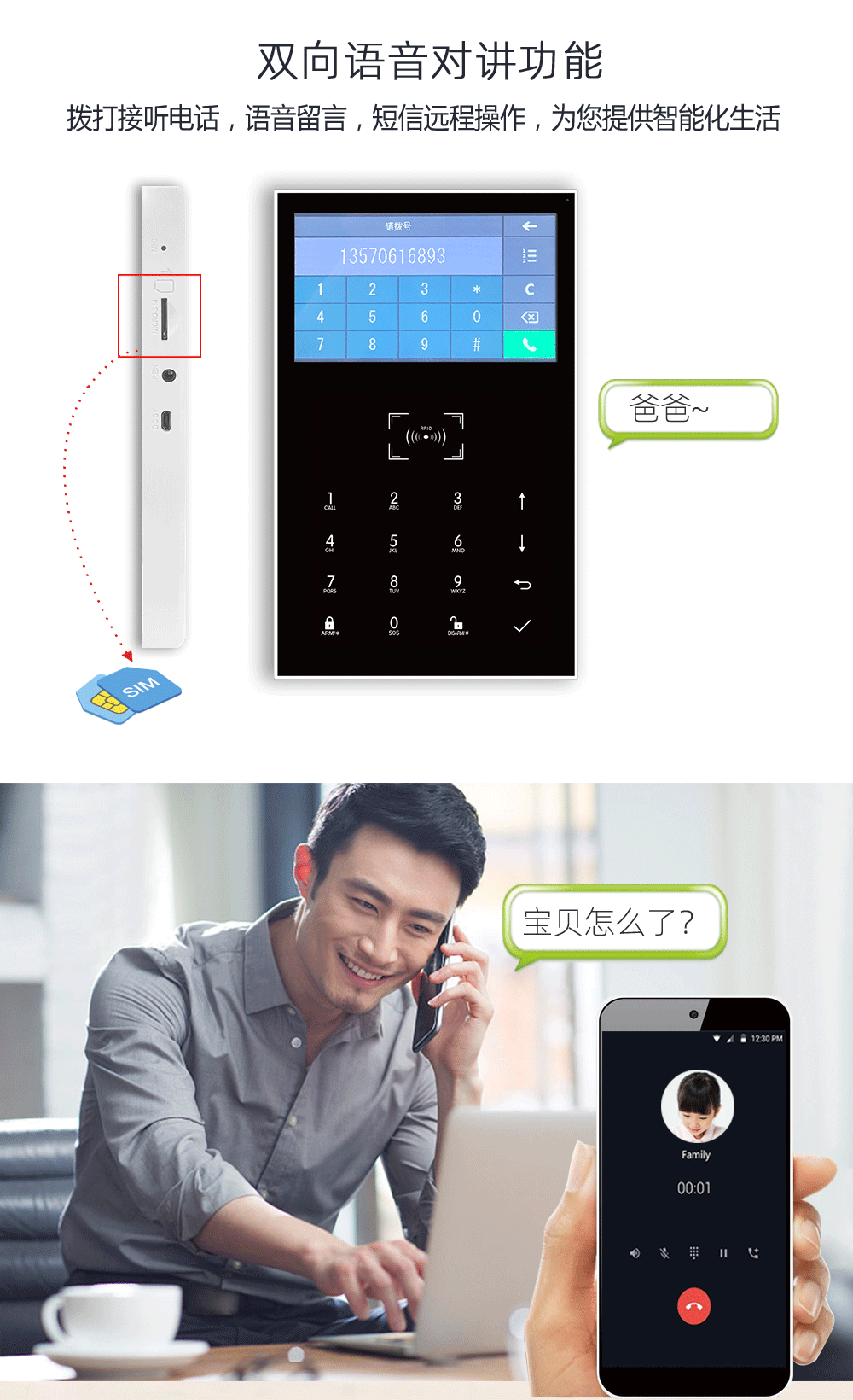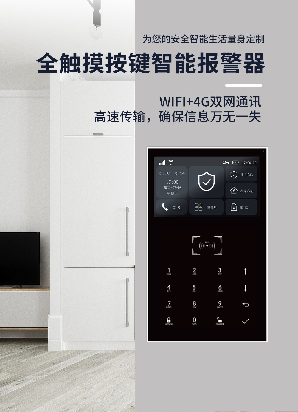 双网模式WIFI+GSM/4G,支持app推送、短信推送和语音监听等多通道报警方式;