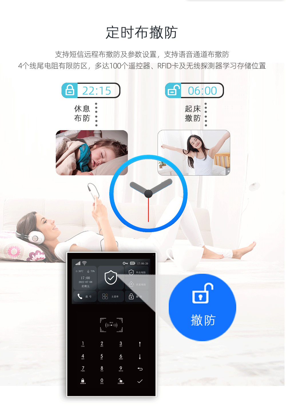 支持外出防区、在家防区、周界防区,24小时防区、门铃防区等多个防区类型设置;