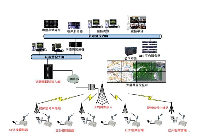 系统主要由安装于航道的视频采集摄像系统、传输系统和安装于指挥中心的显控设备三部分组成,传输系统采用光缆或其它通讯方式。
