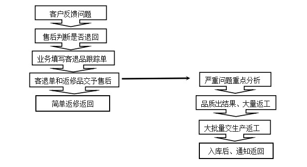 2 针对客户反馈的问题需要返回的,需跟业务员交流,根据发货时间 数量 问题所在,并且让业务员填写《客退品跟踪单》《纠正预防措施报告》,进行分析评估,根据数量的多少问题的轻重来决定是否该返生产线进行第二次生产加工。少量(5`15套分类)的自行维修处理。处理好后,填写单据签字,业务员跟客户沟通后直接返回客户手中。