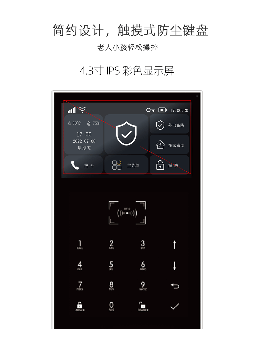 4.3寸IPS彩色全电容触摸按键,简约风格,手感佳;