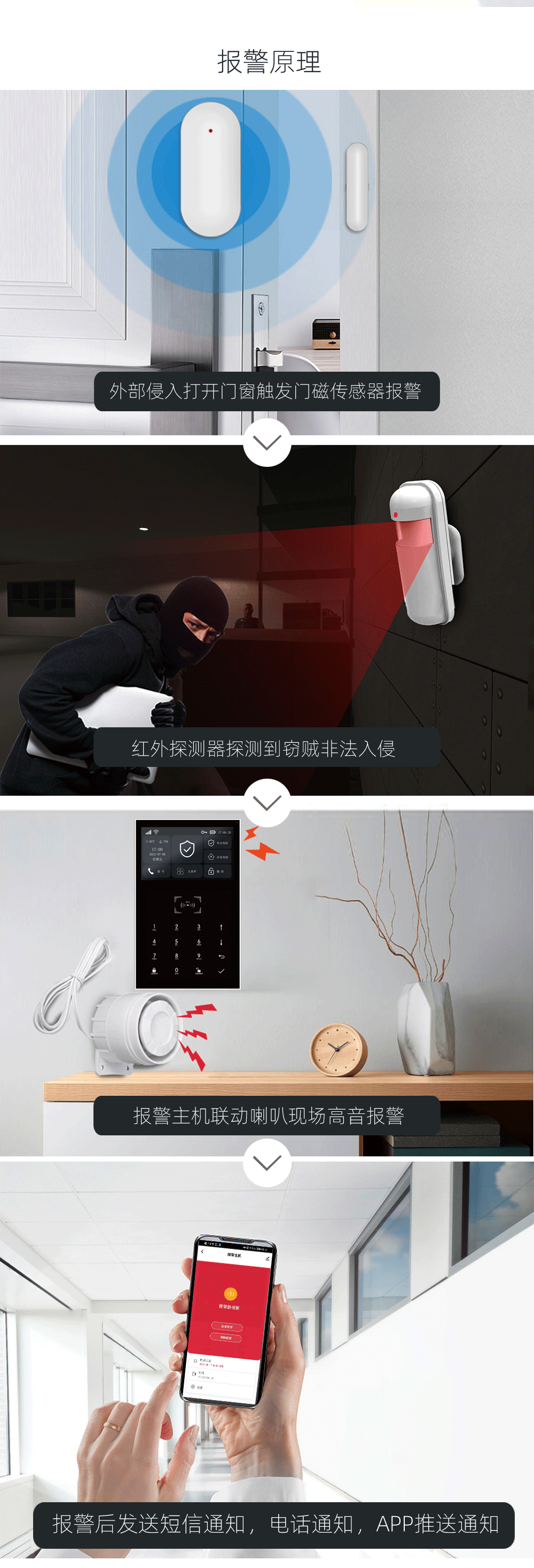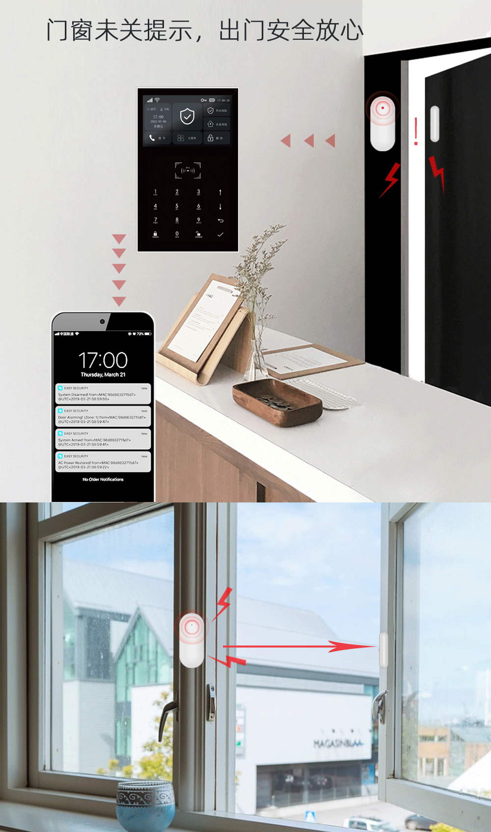 无线传感器低电压报警提醒;布防时门窗未关提示;
